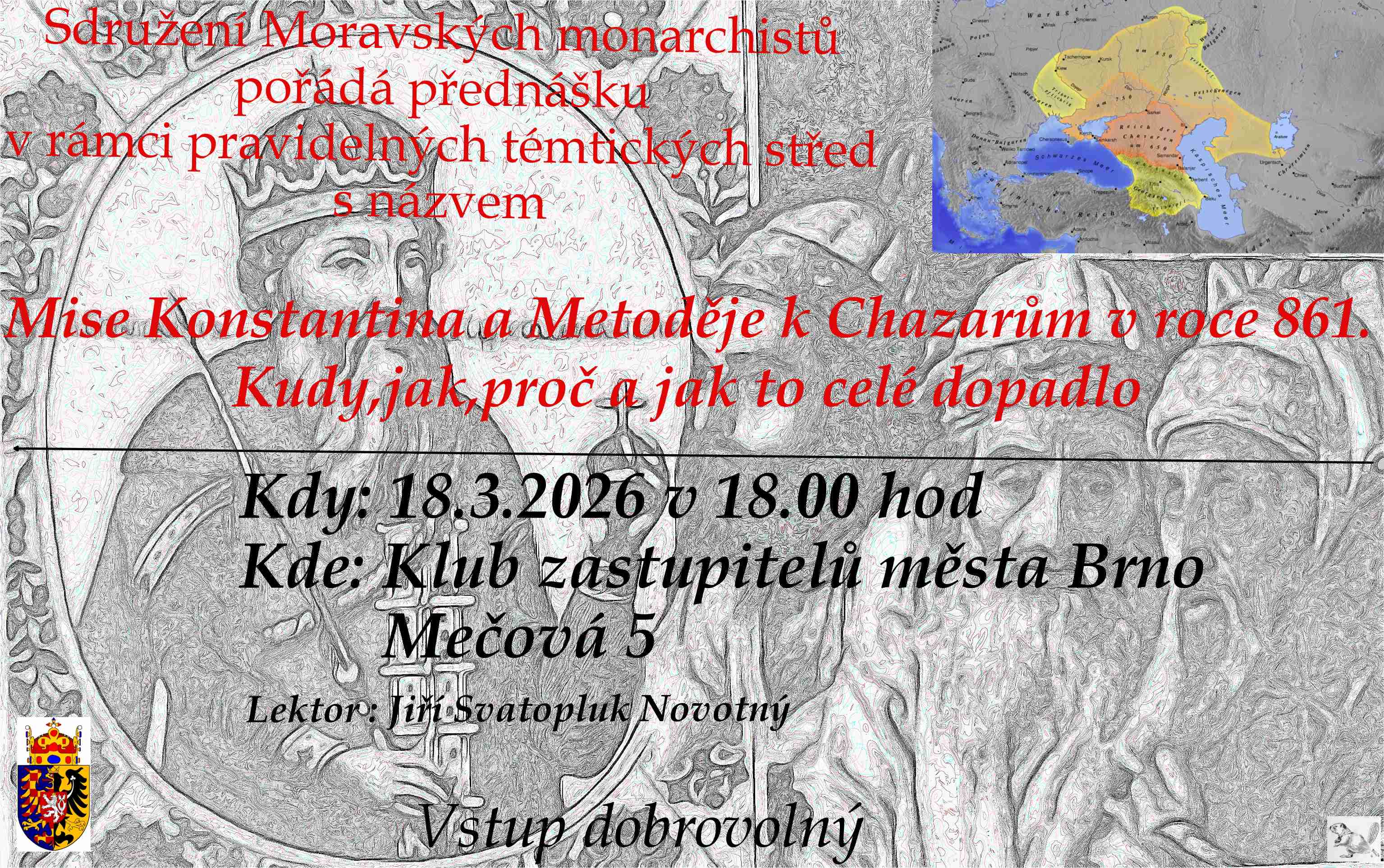 29. 3. 2026 Olomouc univerzitní![]() 29. 3. 2026 Po Černé cestě![]() 28. 3. 2026 Událost jara![]() 18. 3. 2026 Mise Konstantina a Metoděje![]() 1. 3. 2026 Masopustní prohlídky na hradě Šternberk![]() Masopustní prohlídky na hradě Šternberk 28. 2. 2026 Pozvánka na košt slivovice![]() 22. 2. 2026 Mezinárodní den průvodců v Olomouci![]() 21. 2. 2026 Pouť k hrobu císařovny Zity do Vídně![]() 18. 2. 2026 Pozvánka na únorovou tematickou středu Vážení příznivci,dovolte mi, abych Vás jménem Sdružení moravských monarchistů pozval na naší tradiční "Tématickou středu" tentokrát s názvem "Karel Havlíček Borovský v Brixenu" dozvíte se něco o tom, jak se chovalo "mocnářství" k tomuto novináři, spisovateli, o tom jaký měl těžký život ve "vyhnanství" (nejen) ![]() 30. 1. 2026 Ples Koruny České![]() 21. 1. 2026 Lidová tvorba na Slovácku - cimbál![]() 11. 1. 2026 Slavnostní setkání v Brandýse![]() 10. 1. 2026 Slavnostní bohoslužba ve Strážnici![]() 9. 1. 2026 Tříkrálový koncert za svitu hořících luceren v Muzeu kočárů Vážená veřejnosti, přijměte naše pozvání na Tříkrálový galavečer pořádaný v Muzeu kočárů dne 9. 1. 2026 od 18.00 hod. Při svitu hořících luceren a rozsvíceného největšího kočáru prožijeme nádhernou atmosféru Tříkrálového koncertu Jiřího Pavlici a Hradišťanu. Vstupenky zakoupíte: